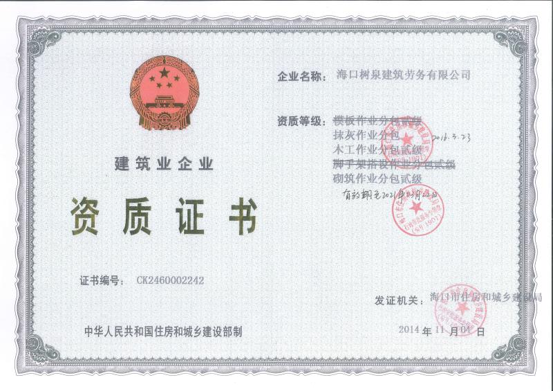 ??跇淙ㄖ趧沼邢薰境闪⒂?011年,公司位于???,其前身是一家專業建筑施工隊,自2004年即開始在海南從事建筑勞務施工。自成立至今,公司已經擁有一支科學管理、質量過硬、能打硬仗,搶工期的專業隊伍。能獨立承擔大中型工業與民用建筑 、室內外裝修、各類機電設備安裝工程。代表工程有??跒I海華庭、三亞時代海岸T01/02/04/05棟高層、合肥東?;▓@二期、陵水富力灣B區高層、三亞金中海(酒店)、瓊海大印經典花園、??诃h球海景大酒店(四星級酒店,在建中)、陵水珍珠大廈(五星酒店)、??谌f達廣場、美蘭機場二期。